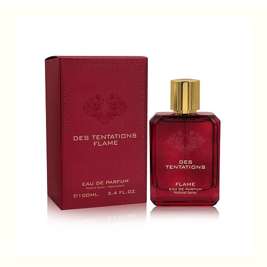 Des Tentations Flame de Fragrance World. Es una fragancia amaderada especiada para hombre que huele a una mezcla intensa de frescura cítrica y calidez seductora. Destaca por sus notas vibrantes de mandarina, pimienta negra, limón y romero, con un fondo dulce y amaderado de vainilla, haba tonka y cedro. Aroma Principal: Cítrico, especiado, amaderado y dulce. Notas de Salida: Mandarina, limón, pimienta negra, romero y chinotto. Notas de Corazón: Pimienta, geranio y rosa. Notas de Fondo: Vainilla, haba tonka, cedro de Texas, sándalo y pachulí.