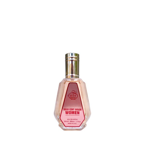Deux Cent Douze Women de Fragrance World es una fragancia de la familia olfativa Floral para Mujeres. Deux Cent Douze Women se lanzó en 2020. Las Notas de Salida son pimienta rosa, bergamota, mandarina y naranja. Las Notas de Corazón son notas florales, algodón de azúcar, pelargonio, gardenia y rosa. Las Notas de Fondo son sándalo, pachulí, vainilla, caramelo, violeta y almizcle.