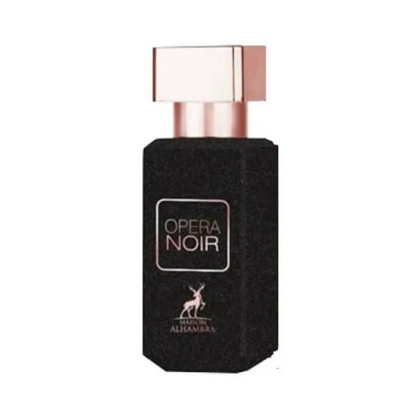 Opera Noir, Maison Alhambra; Las Notas de Salida son pera y pimienta rosa; las Notas de Corazón son jazmín, café y pimienta rosa; las Notas de Fondo son cedro, vainilla y pachulí.